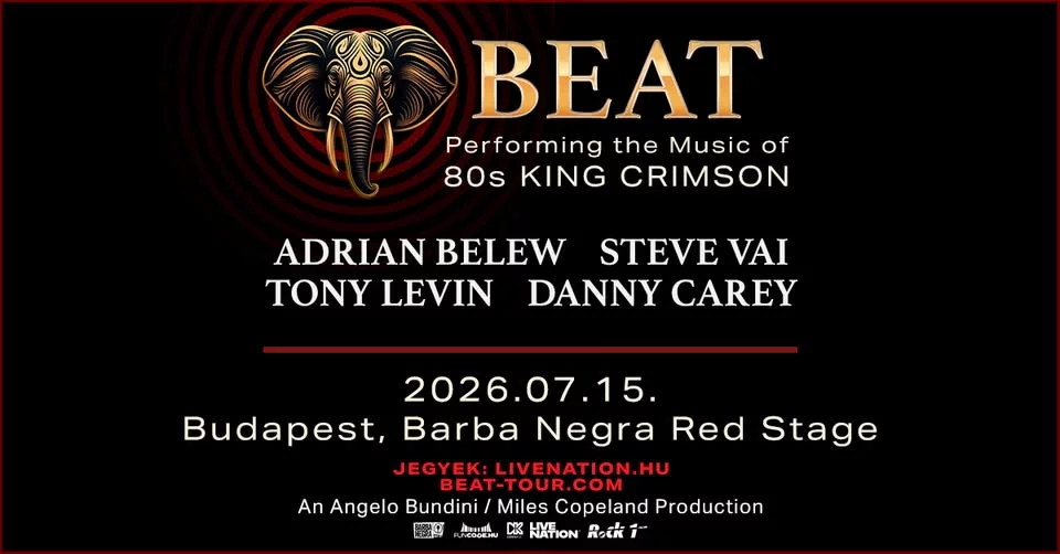 A BEAT először érkezik Budapestre, ami az ikonikus King Crimson zenekar ’80-as években született dalait állítja színpadra. 2026. július 15-én Steve Vai gitáros, a Tool dobosa Danny Carey és két eredeti King Crimson-tag Adrian Belew és Tony Levin kápráztatják el virtuóz játékukkal a magyar közönséget a Barba Negrában.